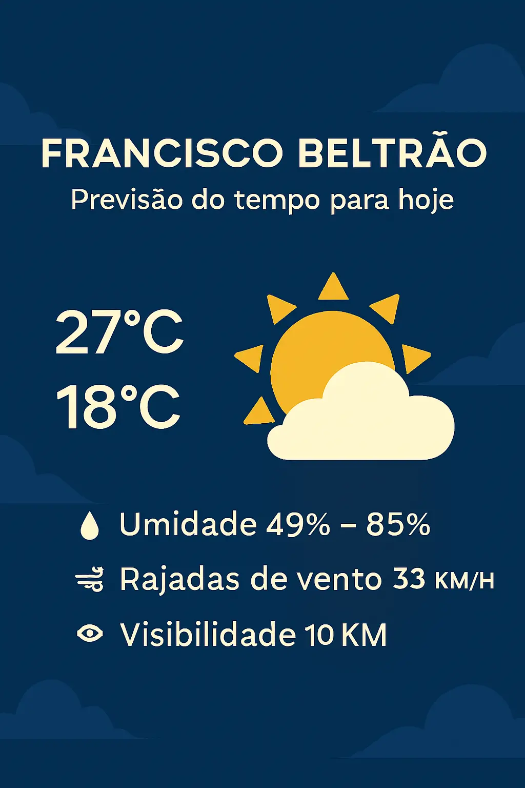 A previsão do tempo para Francisco Beltrão hoje aponta para um dia tranquilo, com céu parcialmente nublado, temperaturas entre 18°C e 27°C, umidade equilibrada e ventos suaves. Para quem busca informações confiáveis e atualizadas, o site do é a principal referência em meteorologia no Paraná. Mantenha-se informado, planeje suas atividades com antecedência e aproveite o dia com segurança e bem-estar.