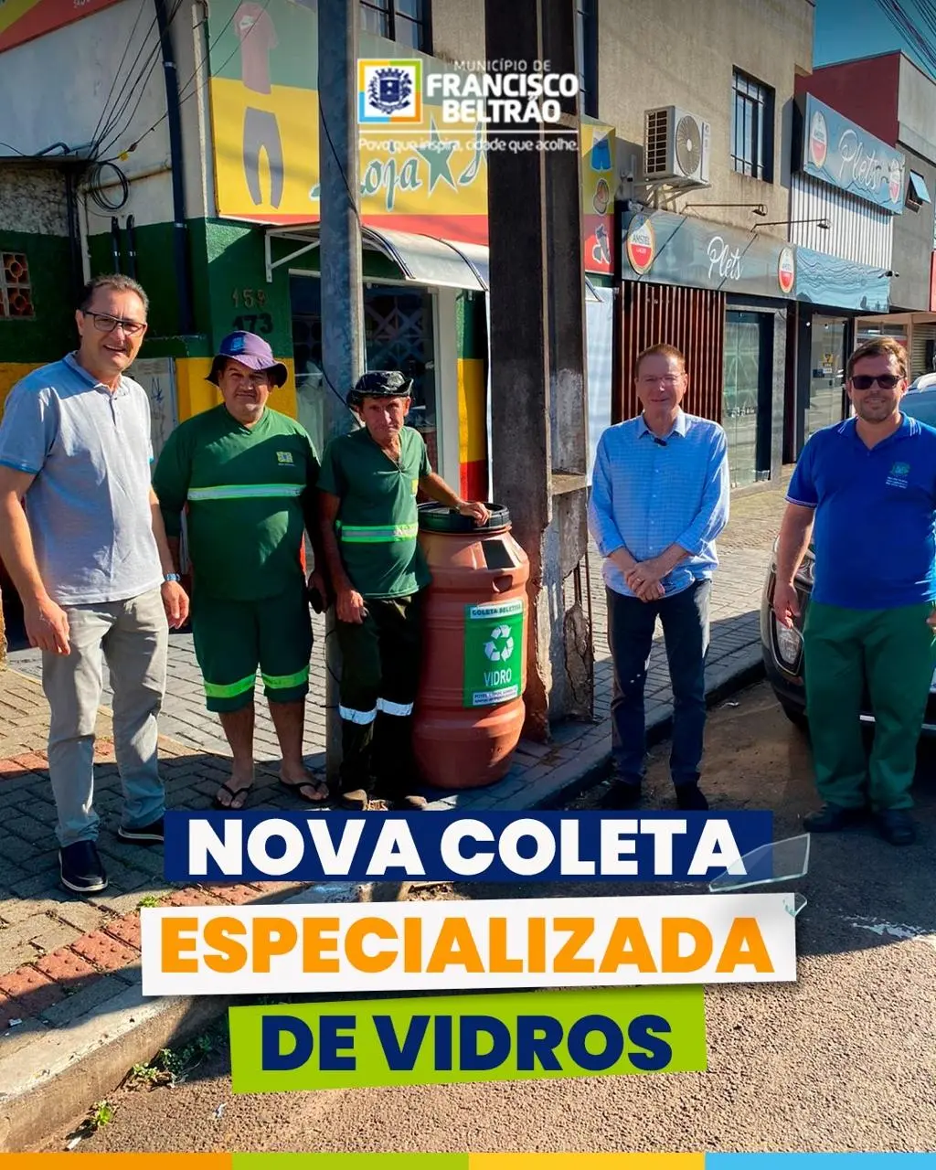 A Prefeitura de Francisco Beltrão deu início, na manhã desta sexta-feira (05), ao projeto-piloto da nova coleta especializada de vidros, ampliando as ações de modernização da gestão de resíduos no município. O ato contou com a participação do prefeito Antonio Pedron, do secretário de Meio Ambiente, Antonio Cezar Soares, e da equipe técnica responsável.