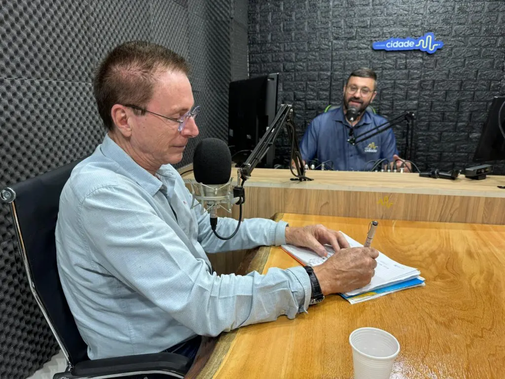 ( Foto Matheus Viana) Kadhu Guerreiro entrevista o Prefeito Pedron no antigo estúdio.